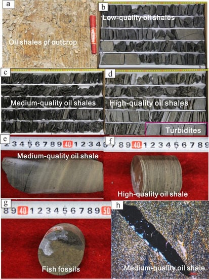 Characteristics of different-quality oil shales. (a) Oil shales in an outcrop, Yuqia area; (b) Low-quality oil shales, 358.30–358.40 m, YYY-1 well; (c) Medium-quality oil shales, 394.06–397.08 m, YYY-1 well; (d) High-quality oil shales, 342.18–343.21 m, YYY-1 well; (e) Medium-quality oil shales, rhythmic bedding, 353.56 m, YYY-1 well; (f) High-quality oil shales, horizontal bedding, 342.80 m, YYY-1 well; (g) Fish fossils in low-quality oil shales, 358.01 m, YYY-1 well; (h) Shell fossils in medium-quality oil shales, 399.67 m, YYY-1 well).