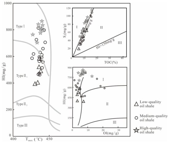 Cross plots of Tmax versus HI, TOC versus S2, and OI versus HI (Figure 5) indicate that the oil shales contain type I-II1 organic matter [64,65,66]. The low-quality oil shales contain type II1 kerogen, the medium-quality oil shales contain both type I-II1 kerogen, and the high-quality oil shales contain type I kerogen.