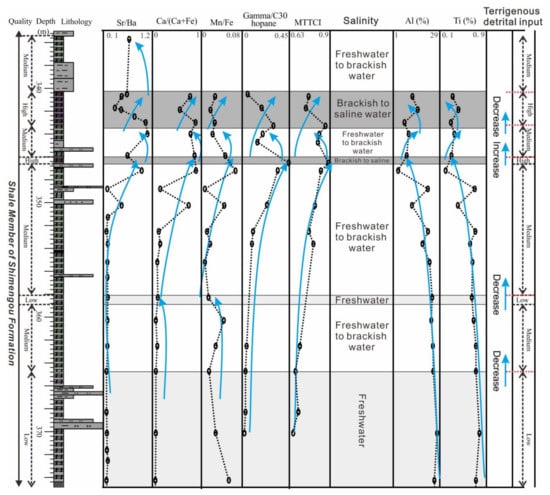 Owing to well-matched positive correlations, the Sr/Ba, Ca/(Ca + Fe), Mn/Fe, gammacerane/C30 αβ hopane, and MTTCI ratios are considered to be good indicators of water salinity (Figure 6). A Sr/Ba ratio <0.5, a Ca/(Ca + Fe) ratio of <0.2, and a low gammacerane/C30 αβ hopane ratio are indicative of freshwater. A Sr/Ba ratio >1.0, a Ca/(Ca + Fe) ratio >0.5 and a high Mn/Fe, MCCTI and gammacerane/C30 αβ hopane ratio suggest saline water [58,72,73,74,75,76,77]. Based on this interpretational framework, these ratios (Table 3 and Table 4) indicate that low-quality oil shales were deposited in freshwater depositional environments, medium-quality oil shales were deposited in freshwater to brackish water depositional environments, and high-quality oil shales were deposited in brackish to saline water depositional environments. In general, from low- to medium- then to high-quality oil shales, the depositional water salinity shows an increasing trend (Figure 6).