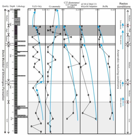 Despite the different oil shale qualities, the V/(V + Ni) ratios of the samples are all higher than 0.54 and the Ce anomaly ratios are all lower than −0.1 (Table 3), reflecting stable anaerobic reducing preservation conditions [33,78,79,80,81]. Biomarker ratios that are indicative of redox conditions include Pr/Ph, C27 diasteranes/C27 regular steranes, and (C19 + C20)/C23 tricyclic terpanes, although lithology can also influence the latter two [58,82,83,84]. These ratios are all lowest in the high-quality oil shales, and highest in the low-quality oil shales (Table 4). This shows that the high-quality oil shales were deposited in the most anaerobic and reducing preservation conditions (Figure 7).