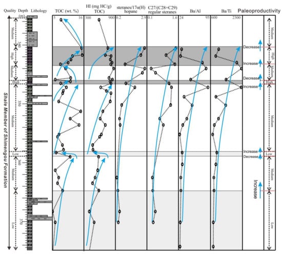 The organic matter input in the study area was mainly controlled by the primary productivity of the paleo-lake, which can be evaluated by the Ba/Ti and Ba/Al element ratios [85,86,87,88] and the TOC content [89]. The results show that the high-quality oil shales had the highest paleoproductivity (Table 3; Figure 8).