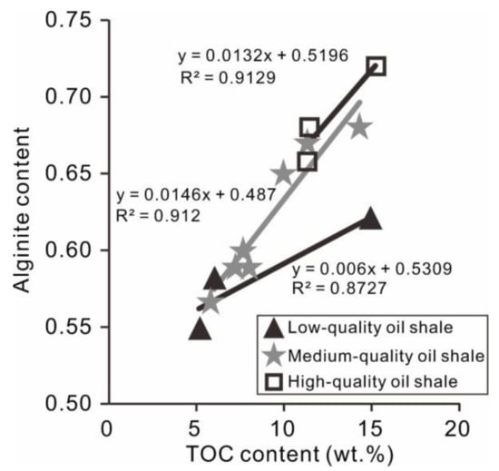 Correlations of total organic carbon (TOC) content and alginite content for the different quality oil shales in the Shale Member of the Shimengou Formation.