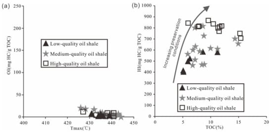 The medium- and high-quality oil shales, especially the latter, have well-developed horizontal and rhythmic bedding (Figure 3e,f). The formation of these particular types of bedding is a sign of lack of bioturbation and bioglyphs during deposition and is related to anoxic to anaerobic preservation conditions. This environment may have been caused by high water salinity, leading to stratification of the water body [106]. When such stratification forms, the bottom of the water body is usually poorly circulated. Without disturbance caused by waves or currents, the activities of the benthos are limited. Consequently, horizontal and rhythmic bedding can be formed [107,108,109]. In addition to water salinity, HI values also reflect the redox preservation conditions. In general, high HI values represent good preservation conditions that are reducing, while low HI values represent poor preservation conditions that are oxidizing [110,111,112]. In the study area, it can be inferred that high-quality oil shales with the highest HI values (Figure 10b) were deposited under the best preservation conditions. In contrast, low-quality oil shales with the lowest HI values were formed most probably in freshwater environments where salinity stratification did not exist, and therefore they were developed in bulk with no bedded structures (Table 2; Figure 3b).