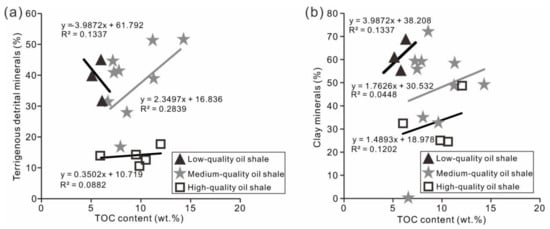Relationships between total organic carbon (TOC) content and (a) terrigenous detrital minerals, and (b) clay minerals in the different-quality oil shales in the Shale Member of the Shimengou Formation.