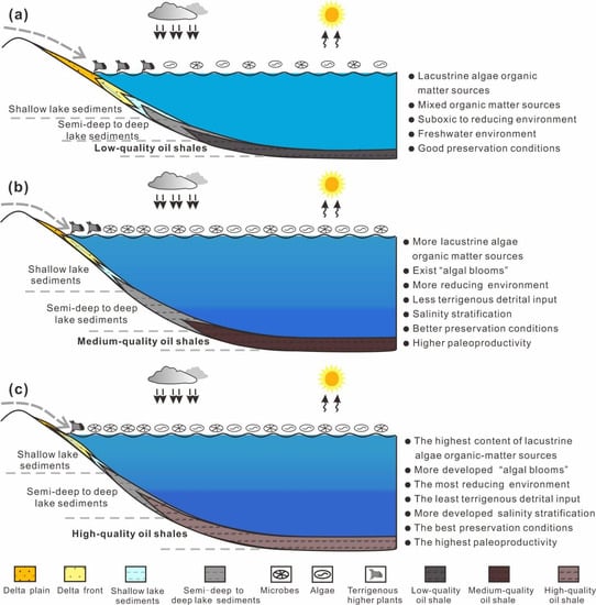 There are two main sources of organic matter for low-quality oil shale lacustrine algae, mixed with terrigenous higher plant inputs. These oil shales were formed in freshwater environments under suboxic to reducing preservation conditions, where rapid and continuous sedimentation occurred without seasonal suspension. Therefore, low-quality oil shales feature uniform, bulky internal structures, and homogeneous chemical properties. Due to the lack of oxygen at the sediment–water interface [113], organic matter was well-preserved, thus forming oil shales of low quality. In this model, a number of factors, including a stable and deep water column, abundant algal sources, weak dilution and degradation of terrigenous detritus, and good preservation conditions, led to organic matter enrichment and the formation of low-quality oil shales (Figure 12a).