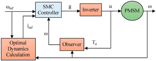 SMC is a widely used robust speed control method for PMSM; it is used in several applications researched in the literature [53] and is applied to multiple systems with different approaches. SMC is a nonlinear control method that is insensitive to changes in motor parameters and loads. SMC enables the system to track a predefined path (sliding surface) on the phase line, and for this purpose, a switching algorithm is used. Theoretically, it is controlled by adjusting the dynamic behavior of the closed loop to match the sliding surface [54,55]. The torque equation of the PMSM model is given as: