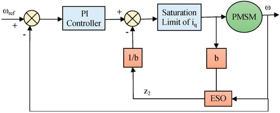 In [71,72], an ESO is developed. This has benefits over traditional observers, i.e., accuracy, robustness, and better dynamic performance independent of the mathematical model. An ESO has the capability of approximating unidentified disturbance affected by high precision and inductance mismatch. Another ESO control method for observing disturbances has been broadly used and is proposed in [73,74]. The ESO groups disturbances, including internal and external disturbances, as a new state variable that builds the novel extensive state equation, and formerly evaluates the state variables of the extensive state equation [75]. The ESO is an actual perturbation observer; it does not require the direct measurement of the perturbation and disturbance model. Active disturbance rejection control (ADRC) [76] is broadly used in power converter control, PMSM, and robotic control systems, etc. For the PMSM control system, a second order model is proposed for speed regulation in [77,78]; furthermore, active feed forward compensation is also proposed to minimize the chatter of the SMC and enhance the robustness. High accuracy position assessment is achieved by using linear ESO in [79]. For robustness in the full speed variety, LESO is implanted in the current controller. The ESO’s ADRC controller is designed for elevator traction machines. It is observed that nonlinear disturbance in the elevator turn on condition can increase the dynamic reaction exclusive of using a weight sensor [80]. A basic structure diagram of the PMSM ESO-based controller is illustrated in Figure 9.