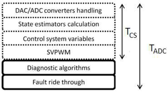 where xn is the sequence of registered samples, and k/N is the frequency of the sinusoidal wave-k cycles per N samples. DFT is usually calculated using the butterfly algorithm for the Fast Fourier Transform invented by Cooley and Tukey [34], which provides the increased efficiency of calculations by decreasing the computational complexity from O(N2) to O(Nlog(N)). Most faults in AC machines can be identified on the basis of one or a group of fault-related harmonics, thus it is more efficient to perform a diagnosis using algorithms providing direct calculation of the fault harmonic, unless all harmonics in the spectrum are needed. Efficient fault diagnosis algorithms are highly desired considering a limited time between microprocessor interrupts, as presented in Figure 1, and the high computational complexity resulting from the need to calculate state variable estimators required for both sensor-based and sensorless control system topologies. The rotor fault diagnosis of the induction motor can be identified by analyzing a selected state variable, e.g., phase stator current, Park’s vector modulus of the stator current, estimated rotor flux, electromagnetic torque or rotor speed during the steady-state operation of the machine [21,29]. The calculation of all harmonics in the spectrum using the FFT algorithm increases the number of arithmetical operations, which, consequently, increases the overall time of calculations and involves more memory resources in the microprocessor. Considering a known fault-related harmonic frequency (2), the amplitude of the harmonic at the fault frequency is directly calculated from the current stator phase measurement results using the recursive algorithm: