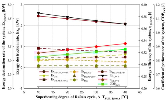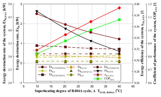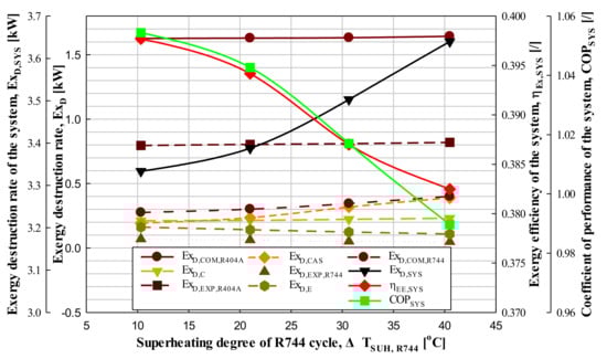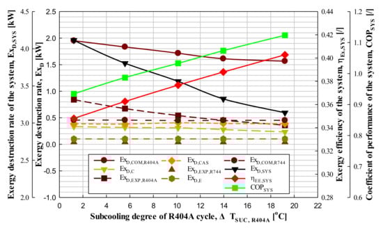 - The COP, exergy efficiency, and exergy destruction rate of a CRS have a close relationship. The lower the total exergy destruction rate of the system, the higher the exergy efficiency of the system and accordingly the COP of the system is also improved.