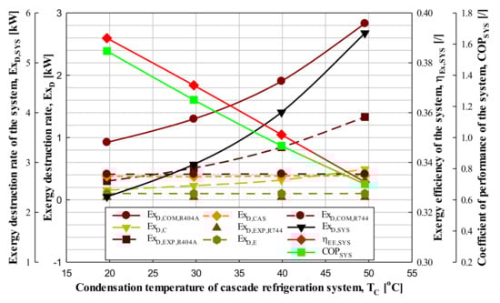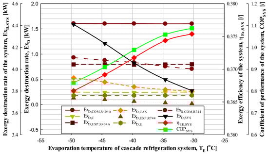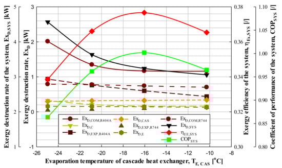 - In the CRS, since the optimum cascade evaporation temperature exists (about −16 °C), it can be said that the limit point, that is, the cascade evaporation temperature with the maximum COP of the system, is the optimum point at about −16 °C. Therefore, at this optimum point (i.e., optimum cascade evaporation temperature or evaporation pressure), the exergy destruction rate of the cascade heat exchanger is at its minimum value. In other words, it should be noted that when the cascade evaporation temperature is the optimum point, the exergy destruction rate of the R744 compressor and the cascade heat exchanger is minimal.