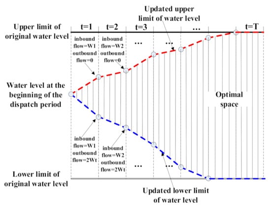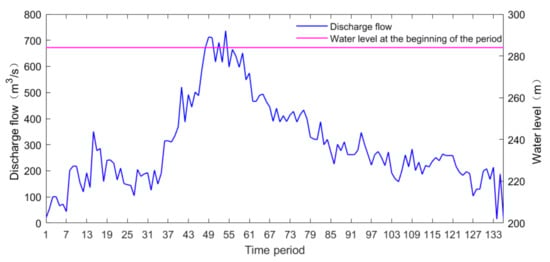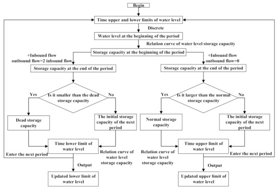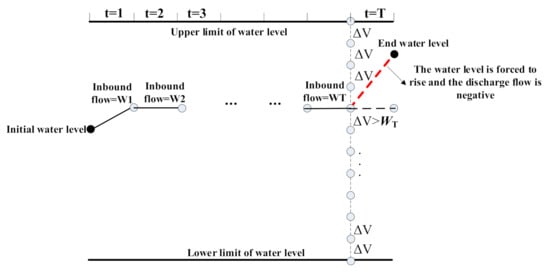 To solve this problem, the rules for determining the upper and lower limits of the dynamic water level are proposed in this paper. The process is shown in Figure 1. According to the amount of inbound flow and initial storage capacity in each period, the upper limit of the water level in each period is determined according to the total inbound flow into the reservoir (as shown in Figure 2). The lower limit of the water level at each period is determined based on the outbound flow equal to the inbound flow or the principle of maximum discharge. In this way, a dynamic upper and lower limit of the water level is obtained, and at the same time, unnecessary discrete calculation of DP in the initial retraction space is avoided, which can greatly reduce the calculation time.