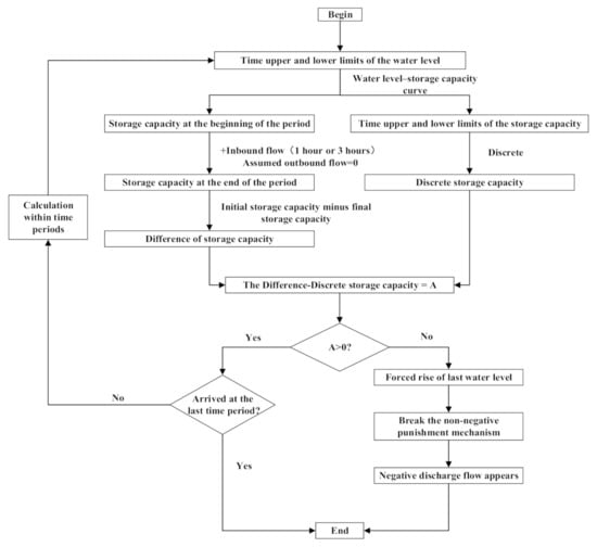 In the DP calculation, when the period is very small, such as on the hourly scale, if the degree of dispersion is insufficient, the discharge flow will often be negative in the calculation result. At this time, the total amount of water in a period is very small. When there are fewer discrete points of storage capacity, each discrete storage capacity is very large, so even if all the water in a period is stored, it cannot meet the demand for upward fluctuation of a discrete point. At this time, the penalty mechanism of DP calculation will be destroyed. Eventually, to meet the requirements of the final water level of the scheduling, the water level will forcibly rise, and then there will be a negative discharge flow (as shown in Figure 3). To solve this problem, an effective variation dispersion mechanism is proposed in this paper. That is, according to the amount of inbound flow in each period, the discrete degree of reservoir capacity is dynamically determined to ensure that inbound flow can make the discrete point of water level change upward by at least one point. The process is shown in Figure 4. The rules for determining the minimum number of discrete points in each period are as follows: