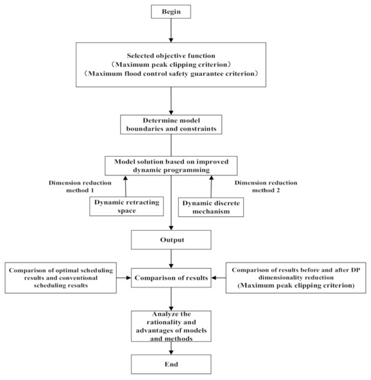 After nearly 50 years of research, there are many existing mathematical models of reservoir scheduling. They can be divided into four categories according to system input and functional characteristics: deterministic reservoir optimal scheduling model; random reservoir optimal scheduling model; fuzzy reservoir optimal scheduling model; and multi-objective decision-making theory and its application in reservoir optimal scheduling. At present, many optimization algorithms have been applied to the solution of the reservoir flood control optimal scheduling model. The traditional optimization algorithms include linear programming (LP) [1], nonlinear programming (NLP) [2], and dynamic programming (DP) [3]. Dynamic programming has many advantages: First, Bellman’s optimality principle promotes a two-stage formula that greatly simplifies the multi-stage decision process (Bellman 1957) [4]. Second, the DP discretizes the continuous storage state of the reservoir and searches for the optimal decisions numerically. The numerical search efficiently deals with nonlinear and non-continuous objective functions and constraints [5,6,7]. Third, the two-stage formulation of DP quantifies the trade-offs between current and future time periods and provides insights into black-box optimization models. However, the DP method also has shortcomings, such as serious dimensionality problems. Especially when the scheduling period is a small time scale, and the flow of a period is very small, to ensure the validity of the calculation the dispersion is very large and the calculation time will be very long in the whole calculation process. If the dispersion is reduced, the DP penalty mechanism will be destroyed, and the negative discharge flow will occur.