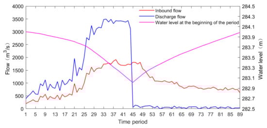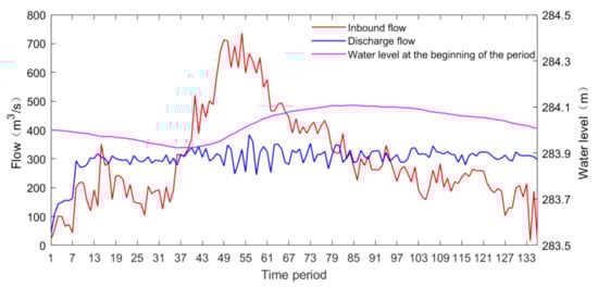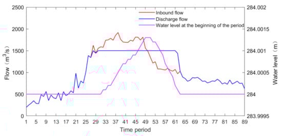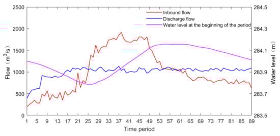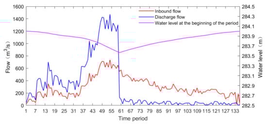 - The scheduling time intervals of the two floods are 1 h. The scheduling periods of the first flood are 136 periods; the scheduling periods of the second flood are 89 periods. Among them, the first flood began on 17 March 2020, and stopped on 22 March 2020 and the second flood began on 1 April 2020, and stopped on 5 April 2020.