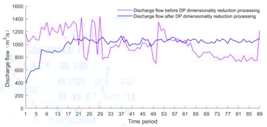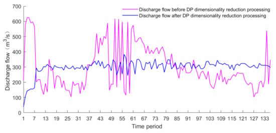 It can be seen from Table 1 that after the DP processing, the calculation time is lower than that before the processing due to the formation of a variable retraction space. The first flood is reduced by 106 s, which is equivalent to a reduction of 65%, and the second flood is reduced by 37 s, which is equivalent to a reduction of 59%. It can be seen from Figure 15 that, on the whole, after the DP dimensionality reduction processing, the discharge flow is concentrated around 300 m3/s, and the flow before processing fluctuates in the range of 100 m3/s–600 m3/s, which is extremely unstable. Especially in the 49–61 period, the contrast is obvious. For the same reason, it can be seen from Figure 16 that the discharge flow after DP dimensionality reduction processing is mainly concentrated around 1000 m3/s, and the flow before processing fluctuates in the range of 800 m3/–1400 m3/s, which is not concentrated near a certain fixed value.