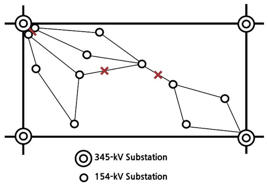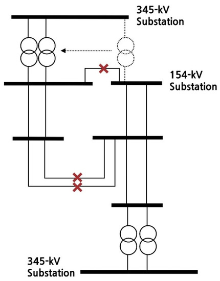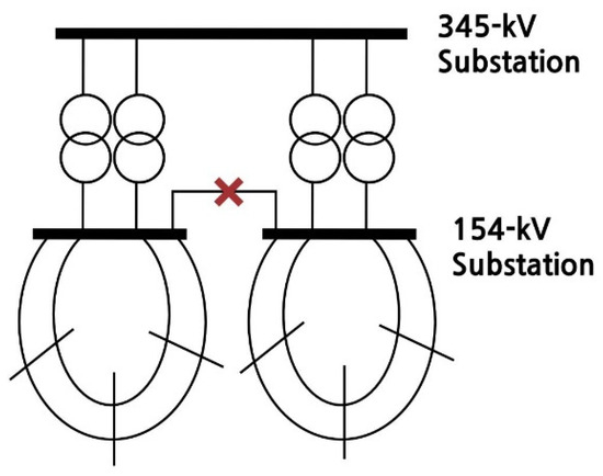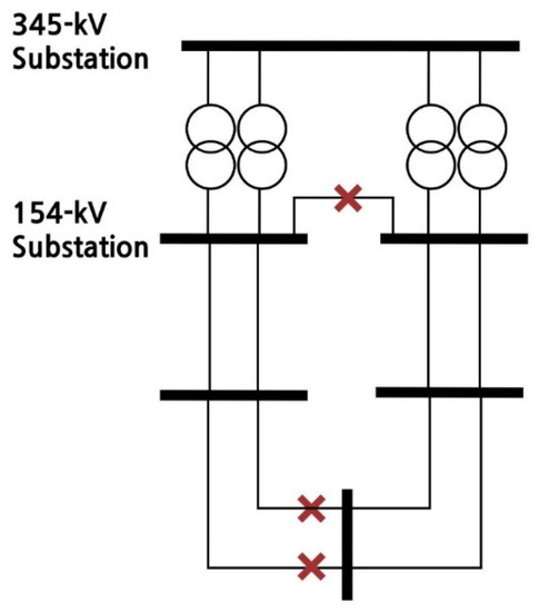 In the case of Figure 2, because the transformer capacity is insufficient, if the 154 kV subsystem is configured independently and one transformer fails, the reliability notice may be violated. Therefore, in this case, the lower end is connected to maintain the stability of the system. In the case of performing busbar separation in this manner, the degree of reduction of the short-circuit current is limited, because additional line separation is not performed.