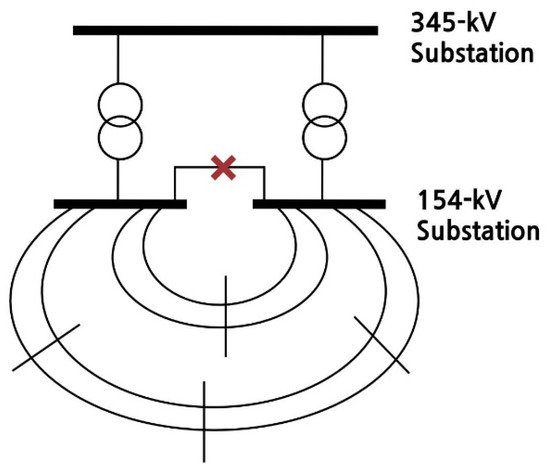 In the case of Figure 1, because the transformer capacity is sufficient, the 154 kV subsystem is independently configured to block the additional inflow path of the short-circuit current, significantly reducing the short-circuit current. Additionally, even if one transformer fails, the reliability notice is not violated, because the stability of the system can be maintained as is. Therefore, in this case, a method for reducing the short-circuit current of the system is selected by additionally implementing a line separation method at an appropriate location so that the lower stage is not connected.