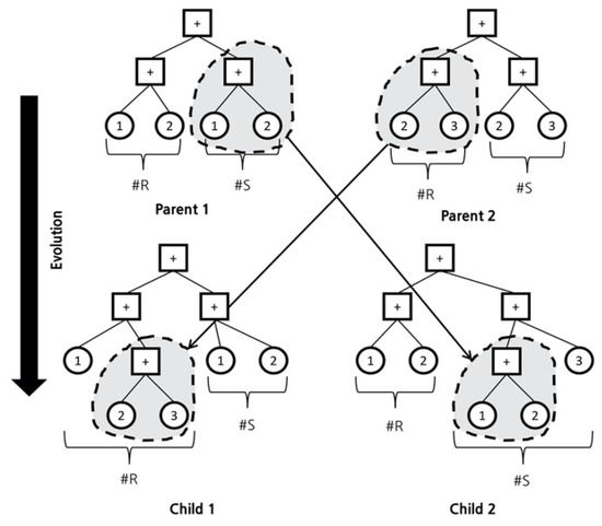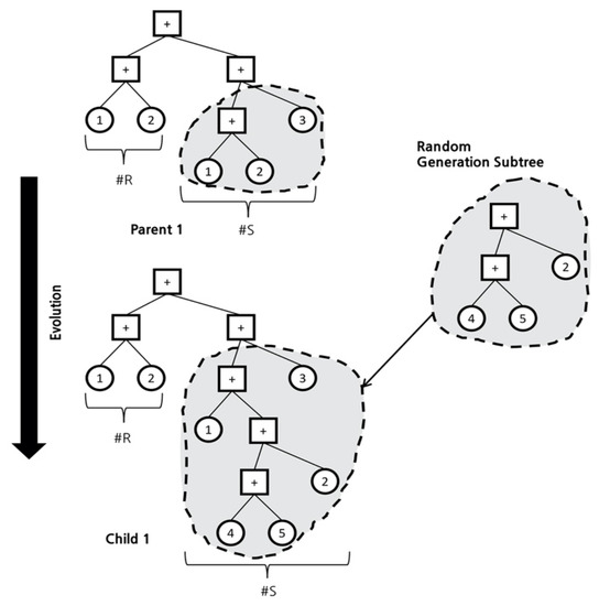In GP, the operation with crossover or mutation is performed on the parent chromosomes to generate a new chromosome. Chromosomes of the same length may be created; although, in some cases, chromosomes of different lengths are generated. Figure 7 shows the process of generating a new chromosome by crossing two parent chromosomes, and Figure 8 shows the process of creating a new mutation by adding a random chromosome to a parent chromosome. By combining these two processes, chromosomes of various new forms can be created, among which the most ideal form is obtained as the optimization result. To obtain the ideal form, a fitness function is used to obtain the optimal results.