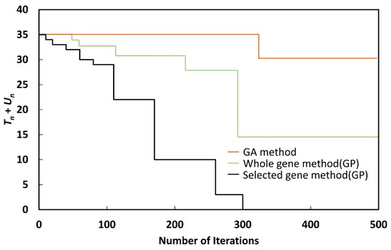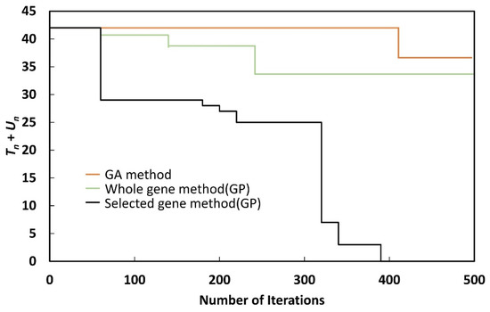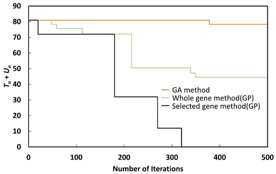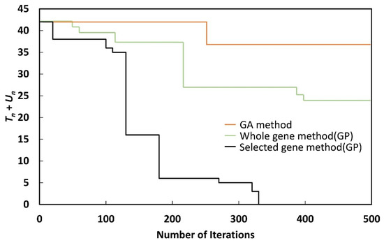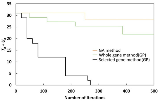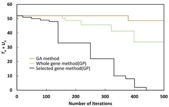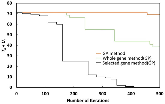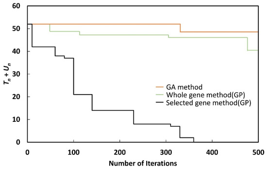 As shown in Figure 9, Figure 10, Figure 11, Figure 12, Figure 13, Figure 14, Figure 15 and Figure 16, although Tn + Un could be reduced to zero with the selected gene method, when the whole gene method or GA method was used, Tn + Un could not be reduced to zero, even after 500 generations. Although the whole gene method could reduce Tn + Un to zero by performing more iterations, the nature of GP makes this undesirable, as the process takes a long time.