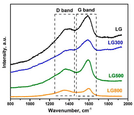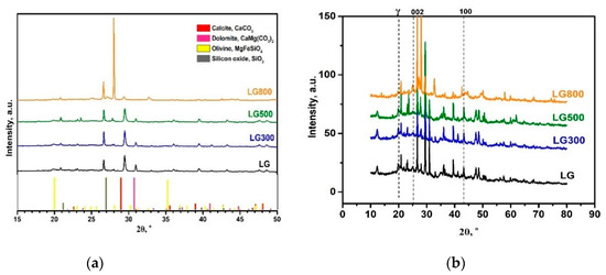 where Car and Cal are the numbers of aromatic and aliphatic carbon atoms, respectively. From the XRD spectra depicted in Figure 1 and the area Aγ used to calculate the aromaticity factor, fa, through Equation (7), the area of γ peak is decreased as the temperature of thermal treatment increases, i.e., from 3.47 for LG to 1.61 for LG800 sample. This behavior indicates the decrease in the number and length of aliphatic side chains at the aromatic structure edges, i.e., the decrease of the aliphatic character of fuels. However, there is an increase in the area of the 002 band upon increasing the thermal treatment temperature (from 2.2 for LG to 4.76 for LG 800), which could be indicative of larger crystals for the condensed aromatic rings. Therefore, the increased aromaticity of chars with thermal treatment temperature could be attributed to both shorter/less aliphatic chains present in the samples, as well as to the larger microcrystals of the aromatic structure. The fa values extracted from XRD analysis (Table 1) revealed the same trend as that obtained from ultimate and proximate analysis (Table 1), further verifying the enhanced aromaticity of char fuels upon increasing the thermal treatment temperature.
