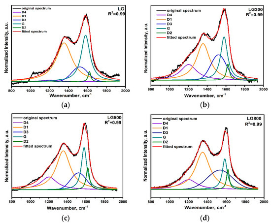 D band is ascribed to the disordered structure of carbonaceous matter, while G band is associated with the vibrations of aromatic rings (graphite lattice) presented at varying intensities in highly or less ordered carbonaceous structures [42,51,52,53,54,55,56]. However, the significant overlap between the D and G bands results in a loss or misinterpretation of structure information, especially for highly disordered carbonaceous materials such as low-rank coals. To resolve this issue, deconvolution of original Raman spectra was conducted in order to more precisely analyze the fuels’ structural properties. In specific, each Raman spectra was baseline corrected and peak-fitted into four Lorentzian bands (D4, D1, G, D2) and one Gaussian band (D3), as depicted in Figure 3a–d. The G band corresponds to the stretching mode of the C=C alkene bond found on perfect single crystal graphite, while the D1 band indicates large sp2 bonding of more than six aromatic carbon atoms being presented as in-plane graphite lattice flaws. Detailed analysis concerning the position and origin of the aforementioned bands is well described in literature [54,57,58,59].