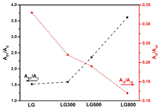 It can be observed that, as the pretreatment temperature increases, the intensity of the G band is progressively decreased, as compared to that of the D1 band. This is an indication that thermal pretreatment resulted in chars with a more disordered structure at their surface compared to the raw fuel, in accordance with relevant literature studies [53,54,60]. Bands area ratios, AD1/AG and AG/Aall, are usually used to semi-quantitatively define the disorder and graphitic carbon degree of the examined fuels, where AD1 and AG correspond to the integral areas of D1 and G bands, respectively. Total Raman area, denoted as Aall, results from the sum of the AD4, AD1, AD3, AG, and AD2. As shown in Figure 4, the band area ratios of AD1/AG and AG/Aall follow an opposite trend upon increasing the pyrolysis temperature.
