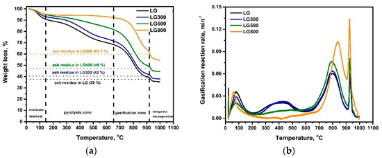 It is generally agreed that during non-isothermal TGA gasification tests, mass loss is attributed to phenomena which occur at different temperature regimes (Figure 5a). Initially, inherent moisture is released at temperatures below 150 °C. Weight loss due to water removal follows the order LG > LG300 > LG500 > LG800 in complete agreement with the moisture content of the fuels (Table 1). Pyrolysis and gasification stages are clearly separated with regard to the temperature regime they take place. In the temperature range between 150–650 °C, mass loss is 22.6, 21.6, 13.8, and 4% for LG, LG300, LG500, and LG800, respectively (Table 2), following the order of the volatile matter content (Table 1). In this temperature range, mass loss is attributed to the primary and secondary devolatilization reactions, including the release of volatile matter, degradation of loosely bonded macromolecules, and thermal decomposition of aliphatic and aromatic structures [62]. The gasification process, for all cases, is initiated at higher temperatures compared to pyrolysis, mainly attributed to the Boudouard reaction, which is thermodynamically favored at temperatures above 700 °C [18]. All fuels present almost the same weight loss in this temperature regime (Table 2). Notably, for LG800, both the initiation and peak temperatures are ca. 50 °C higher compared to the other fuels, possibly due to the higher fixed carbon content along with the lower volatile matter content. The insignificant mass loss presented above 920 °C is associated with the decomposition of the remaining inorganic matter. Notably, the residual mass of all fuels at 920 °C is identical to the content of unreacted ash (Table 1). The high concentration of minerals in both raw Greek lignite and chars can be easily noticed.