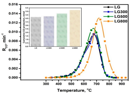 In all cases, carbon monoxide was the main product of gasification, started to appear at ca. 550 °C, reaching its maxima between 650 and 750 °C, and then gradually decreased at temperatures higher than ca. 850 °C until fuel depletion. The production of CO is enhanced with temperature due to the high endothermic nature of the Boudouard reaction [17,32,33,65,66,67]. The LG300 sample exhibited a similar RCO value with raw lignite LG (0.009 min−1), whereas the chars at 500 °C (LG500) and 800 °C (LG800) showed increased instant CO production rates equal to 0.011 and 0.013 min−1, respectively. Notably, the maximum RCO for LG800 shifts at a slightly higher temperature (ca. 730 °C) than the maxima for LG, LG300, and LG500. These findings are consistent with the gasification reaction rate (Figure 5b) and the comprehensive gasification characteristic index (Table 2) obtained by the thermogravimetric analysis. This behavior is also reflected in the higher CO production of LG800 (5.2 mmol) compared to other samples (4.7, 4.3, and 4.1 mmol for LG500, LG300, and LG, respectively), as shown in the inset of Figure 6.