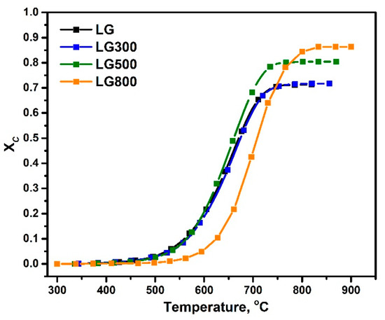 Figure 8 shows the effect of thermal pretreatment temperature on carbon to CO conversion efficiency during non-isothermal CO2 gasification of both raw and as-produced lignite chars. Notably, there are three distinct temperature regimes. At temperatures up to 600 °C, where the devolatilization and tar thermal cracking reactions are prevailing, carbon conversion to CO is almost equal for LG, LG300, and LG500 (XC = 0.2), whereas it is almost zero for the LG800 sample. This behavior implies that CO production for LG800 is essentially negligible during the pyrolysis step reactions due to its very low volatile matter content (Table 1) compared to LG, LG300, and LG500 samples. At the temperature regime between 600 and 750 °C, carbon starts to react with CO2, resulting in a significant CO production. At 750 °C, XC follows the order LG500 (0.81) > LG800 (0.78) > LG300 (0.71) ≈ LG (0.70). At higher temperatures, the carbon conversion for raw and thermally treated lignite chars at 300 and 500 °C reaches a plateau, whereas LG800 exhibits a slight increase up to 800 °C where Xc levels off at ca. 0.90. The superior behavior of LG800 can be attributed to its enhanced fixed carbon content as well as to its more disordered surface structure compared to LG, LG300, and LG500 samples, as previously discussed.