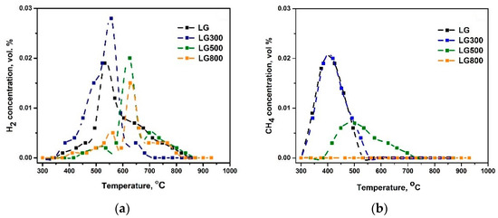 Apart from CO, which is the primary product during CO2 gasification of lignite and as-produced chars, substantially lower amounts of hydrogen and methane were also detected at the effluent of the reactor. Figure 9 illustrates the H2 and CH4 concentration profiles over the examined temperature range. By integrating the corresponding curves in Figure 9a, the cumulative hydrogen production was calculated, and it was found equal to ca. 0.1 mmol for LG and LG300 and 0.08 mmol for LG500 and LG800. Remarkably, for LG and LG300 fuels, hydrogen production appears in the temperature range between 300 and 600 °C, while for LG500 and LG800 samples, H2 evolution is shifted to higher temperatures (600–700 °C). In general, during CO2 gasification, hydrogen is mainly derived by the rapture of the hydrogen rich-matrix in lignite’s structure during the devolatilization step [68]. In this regard, the evolution of H2 during LG and LG300 gasification with CO2, which is maximized at ca. 450 °C, can be attributed to the dehydrogenation of aliphatic and alicyclic structures [69].