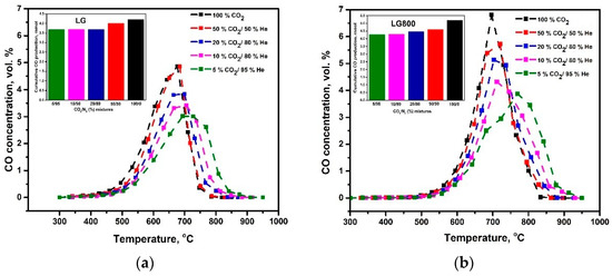 Figure 10 presents the outlet CO concentration profiles in the examined temperature range and the overall production of CO (mmol) under different CO2/He mixtures as gasifying agents and for two representative samples, i.e., LG and LG800. For both fuels, upon increasing CO2 concentration from 5 vol.% CO2/He to pure CO2, CO generation steadily increases, with the effect being more pronounced in the case of LG800 char. Interestingly, as the amount of CO2 decreases, the CO concentration profiles are shifted to higher temperatures retarding at the same time the complete depletion of fuels. In the case of LG and for CO2 concentrations higher than 50 vol.%, the differences in CO production are marginal. This indicates that for CO2 concentrations above 50 vol.%, the process is taking place under excess CO2 conditions. However, this is not the case for LG800, where an increase in CO production is observed upon increasing the CO2 content in the gasifying agent from 50 vol.% to pure CO2 flow. This could be attributed to the higher fuel quantity entering the gasification stage and the increased fixed carbon content of LG800, in agreement with relevant studies [66,70,73,74,75,76].