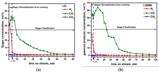 Figure 11 depicts the evolution of syngas constituents over time on stream for LG and LG800 fuel samples until fuel depletion. Focusing on the CO concentration profile, two distinct areas are clearly observed in both cases. Regarding the LG sample, the presence of CO in the first 4 min is mainly ascribed to the devolatilization and tar cracking reactions, which occur during the pyrolysis step. On the contrary, CO evolution at t > 4 min is attributed to the Boudouard reaction, which is thermodynamically favored at 800 °C. The CO concentration profile exhibited a second peak at t = 5 min and then decreased exponentially with time due to fuel consumption. The corresponding concentration profiles for hydrogen and methane are only present during the first four minutes and then totally disappear, indicating the completion of the pyrolysis step and confirming that both H2 and CH4 are mainly derived through the thermal cracking reactions.