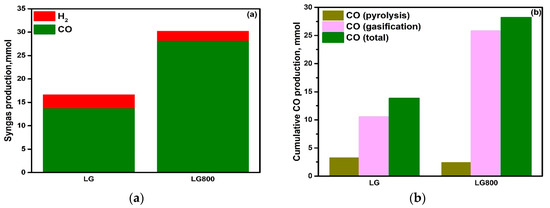 The previous observations are quantitatively mirrored in syngas production, depicted in Figure 12. Carbon monoxide, derived from both pyrolysis and gasification stages, is the primary product, followed by lower quantities of hydrogen and negligible amounts of methane (Figure 12a). The overall production of hydrogen was equal to ca. 2.8 and 2.0 mmol for LG and LG800, respectively. Larger differences were observed for CO production. LG800 produced almost two times higher CO (28 mmol) compared to LG (13.8 mmol) and thus substantial higher amounts of syngas. Figure 12b depicts the individual contribution of pyrolysis and gasification stages to the overall CO production, where it identifies as the enhanced share of char gasification in the case of LG800 char. This indicates that the gasification process is significantly affected by the fuel thermal treatment history. The ex-situ char, LG800, exhibited better gasification performance in terms of syngas production compared to the as-derived “in-situ char” after the devolatilization stage.