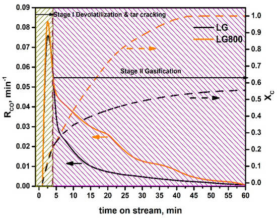 Figure 13 shows the corresponding instant CO production rate (RCO, min−1) and carbon to CO conversion (XC) as a function of time on stream during CO2 gasification of LG and LG800 samples at 800 °C. The CO production rate for both fuels is sharply increased until carbon conversion (XC) of c.a. 0.2, corresponding to the devolatilization and tar thermal cracking stage. Interestingly, both the raw lignite and the ex-situ produced char at 800 °C did not reveal any substantial differences concerning instant CO production rate, indicating the insignificant effect of thermal pretreatment on the CO formation rate during this step. Remarkably, the two examined fuels illustrated a different behavior during the gasification stage. In the case of LG, RCO is drastically decreased and almost nullified at Xc ≈ 0.55. Comparably, RCO illustrated a gradual descending trend for the LG800 sample and became equal to zero when complete conversion of carbon was achieved. Notably, the instant CO production rate for LG800 during the gasification stage was clearly higher than LG. The pronounced gasification performance of LG800 can be presumably ascribed to its higher fixed carbon content and disordered surface structure compared to raw lignite.