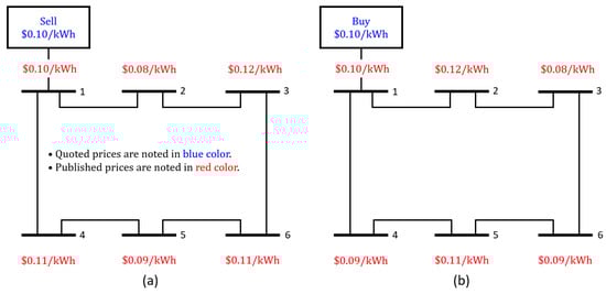 A similar explanation can be made when a consumer quotes a price for buying electricity. Suppose that a producer at bus 1 in Figure 1b submits a purchasing bid of $0.10/kWh. Then, as shown in Figure 1b, it is published at different prices to producers at other buses. The decreased prices at buses 3, 4, and 6 indicate that the transaction between bus 1 and the corresponding nodes will cause more losses. Thus, the associated producer will be paid less in these cases. In contrast, the increase in the price at buses 2 and 5 implies that the transaction between bus 1 and buses 2 and 5 may relieve a heavy-loaded branch while reducing the power losses in the network. Therefore, the associated producer will be rewarded by selling electricity at a higher price. It should be noted that the adjusted prices considering losses are not proportional to the physical distance between the buses associated with the transaction. The losses are determined by power flows, and they also differ from the operating point of power systems. Thus, the adjusted prices can have the same value at different buses such as buses 4 and 6 in Figure 1.