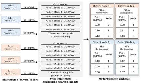 It should be noted that order books on each bus described in Figure 2 are only limited to time t1. Since a matched transaction could affect the power flowing in the network, the electrical distance between buses continues to change following the progress of other transactions even if the physical properties of the network do not change. Therefore, the published prices of offers or bids that reflect the network losses—the electrical distance—keep changing following the change of power flowing in the network, and thus, the order books on each bus change in real-time.