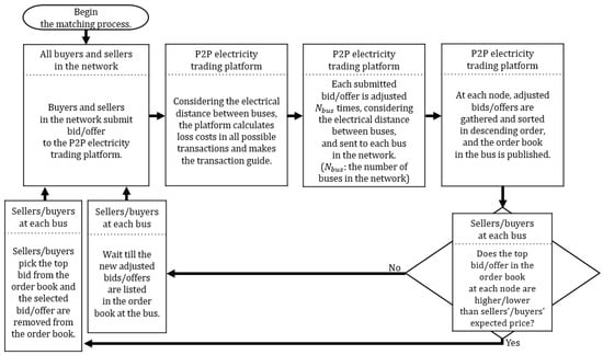 For example, as shown in Figure 2, when a producer (a seller) at bus 1 connects the P2P trading platform, the bidding queue of published prices sorted in the merit order, that is, in descending order, is provided to the producer. If the highest price in the queue is greater than the expected selling prices, the producer has only to pick and accept the bid with the highest price. If the highest price is less than the expected price, the producer can choose to submit a new offer with the desired price to the P2P electricity trading platform. Similarly, a consumer (a buyer) has only to pick and accept the offer with the lowest price in the bidding queue if it is less than the expected price; otherwise, the consumer can choose to submit a new bid with the desired price. The matching process described in this subsection is summarized as a flow chart in Figure 3.