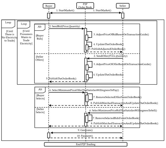 The loss management framework discussed thus far can be expressed as a sequence diagram in Figure 4. The biggest difference between the new loss management framework and the conventional one is that network operators in the former structure do not directly arrange transactions to minimize the network losses, unlike network operators in the latter. The new loss management framework assumes that prosumers always act to maximize their utility and profit. Under this assumption, the new framework just helps prosumers make the rational choice by providing the order book of price-adjusted bids and offers based on the loss costs, therefore, which can be named as a transaction “guide”.
