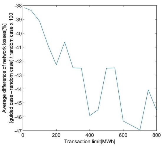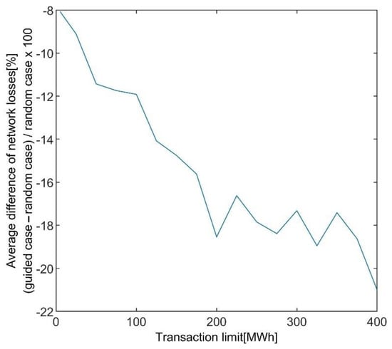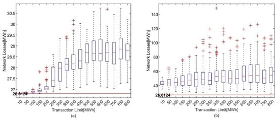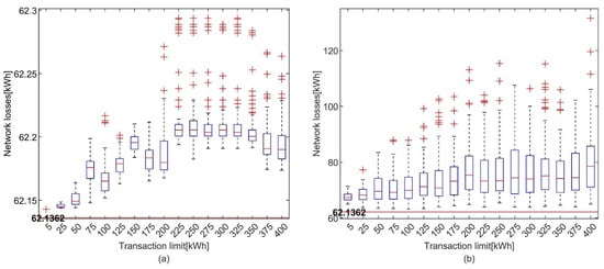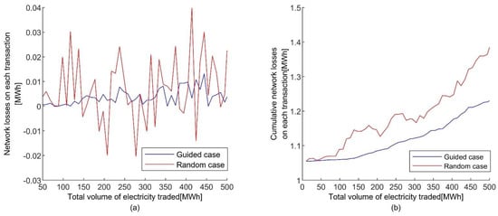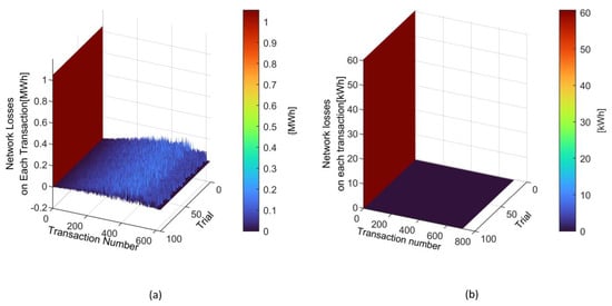 Figure 11. Network Loss depending on the transaction number for the 100 trials of the guided case simulations: (a) the IEEE 39 bus case with the transaction limit 50 MWh; (b) the IEEE 33 bus case with the transaction limit 5 kWh.