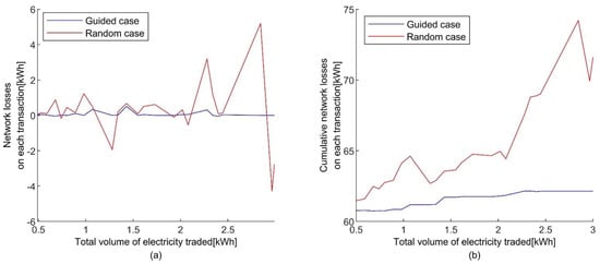 Figure 10. Network losses on each transaction with 5 kWh transaction limit in the IEEE 33 bus case: (a) network losses on each transaction; (b) cumulative network losses on each transaction.