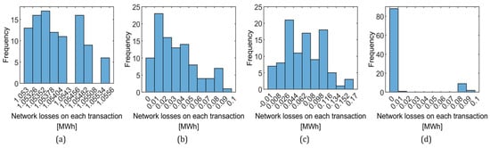 Figure 12. Histograms of network losses of selected transaction numbers in 100 trials of the guided case simulations with the IEEE 39 bus case and the transaction limit 50 MWh: (a) network losses of the #1 transactions in 100 trials; (b) network losses of the #200 transactions in 100 trials; (c) network losses of the #400 transactions in 100 trials; (d) network losses of the #600 transactions in 100 trials.