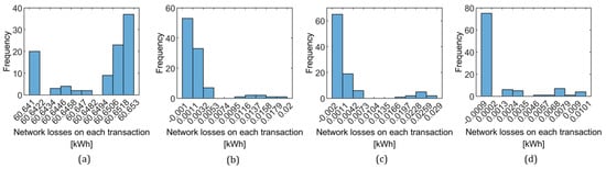 Figure 13. Histograms of network losses of selected transaction numbers in 100 trials of the guided case simulations with the IEEE 33 bus case and the transaction limit 5 kWh: (a) network losses of the #1 transactions in 100 trials; (b) network losses of the #200 transactions in 100 trials; (c) network losses of the #400 transactions in 100 trials; (d) network losses of the #600 transactions in 100 trials.