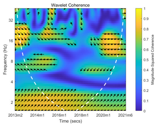 Figure 5b exhibits the wavelet coherency map of crude oil prices and investor sentiment when the crude oil price falls.