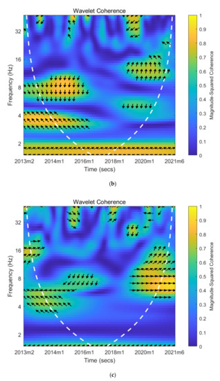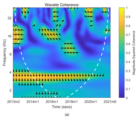 Figure 5a presents the wavelet coherency map of crude oil prices and investor sentiment when the crude oil price rises, while
