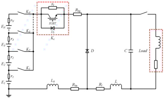 The basic circuit is shown in Figure 1, where are battery packs. Each battery pack consists of battery cells connected in series, and in parallel. is the internal resistance of a single battery cell. are the internal resistances of each battery pack. and are the resistances of the positive and negative transmission cables of the main circuit, respectively. is the stray inductance of the main circuit. and are the inductance and resistance of the current-limiting inductor, respectively. is the pulse capacitor. is the freewheeling diode. are control switches. IGBT, , and together compose the main switch of the primary circuit.