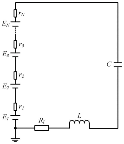 where is the total resistance in the circuit; is the charging current; is the open-circuit voltage of each battery cell; is the open-circuit voltage of each battery pack; and is the voltage of the pulse capacitor at the time when the battery pack is connected to the circuit.