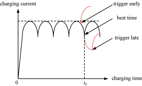 Note that the battery packs are connected to the charging circuit in series, one by one, at different times. The trigger time of the control switch is crucial. If the control switches are triggered in the proper time sequence, the charging current could be approximately constant. Generally, the constant value is designed to be the maximum charging current that can be reached. If a switch is triggered early, the following peak current will exceed the maximum current. If it is triggered late, the following peak current will not reach the required value. The waveform of the charging current is shown in Figure 3.