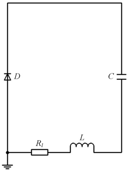 The main switch, , will be turned off when the voltage of reaches the required value. The circuit enters the freewheeling process. The energy stored in the current-limiting inductor will continue to be transferred to the pulse capacitor until the current decreases to zero. Then the diode is turned off. The freewheeling circuit is shown in Figure 4.