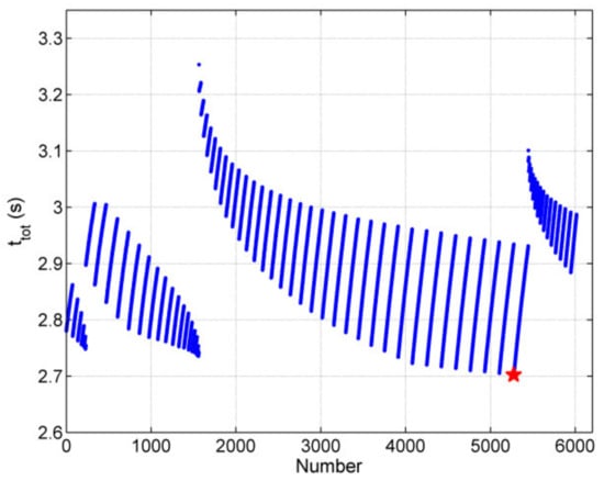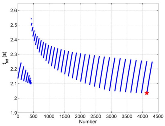First, let us consider the variable selection results and the corresponding total charging time calculation results of the Enumeration algorithm. Figure 8 shows the total charging time calculation results corresponding to all the variable vectors in . There are 4307 solutions in total. Among these points, the optimal solution is associated with the minimum total charging time, shown by the pentagram.