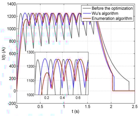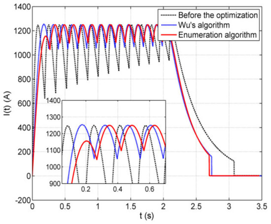 As shown in Figure 15, the first peak value of the charging current is 1155 A for the Enumeration algorithm, and all the other peak values reach the required maximum charging current, 1250 A. By contrast, all the peak values reach the required maximum charging current, 1250 A, for both the “Wu’s algorithm” and “before the optimization”. Note that the charging current of the Enumeration algorithm has more minor fluctuations and is closer to a constant value than the compared algorithm. The total charging time of the Enumeration algorithm is slightly shorter than that of Wu’s algorithm, and obviously shorter than that of “before the optimization”. Hence, in order to shorten the charging time, the constraint condition that the first peak current needs to reach a specified value is unnecessary. In particular, it increases the unnecessary design difficulty of the current-limiting inductor.
